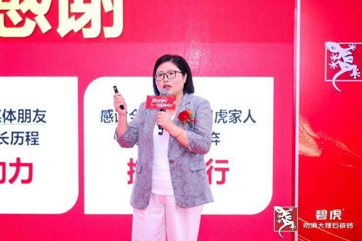 碧虎总经理高玉秀则聚焦“终端创富”,分享实战方法论。她提出“终端不是卖产品的地方,是攒口碑、聚人心的地方”。碧虎防滑大理石瓷砖以“中国瓷砖防滑王”的行业领军者姿态,通过科技创新与立体营销双轮驱动,开创陶瓷行业功能化新赛道。品牌凭借国家认证的国际先进防滑技术(静摩擦系数>0.7)和“防滑=碧虎”的消费者心智占位,构建起覆盖全国900+经销商的网络体系,其360°立体营销帮扶系统更以19.8万元价值赋能合作伙伴,从门店动销、线上引流到区域招商实现全周期闭环管理。