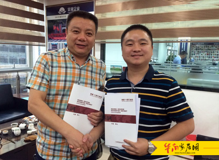 图:新濠大理石瓷砖营销总经理 朱国亮(右一) 云南逸家建材连锁有限公司董事总经理 钟兴(左一)