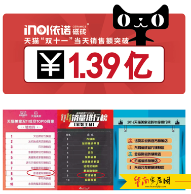 依诺瓷砖用半年时间交出了一份令人瞩目的答卷:双十一当天依诺天猫旗舰店销售额突破1.39亿元!跻身天猫美家瓷砖年度排行榜第四名!在这么短的时间内取得这样的成就,令依诺瓷砖霎时间成为整个陶瓷行业的热点话题。