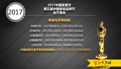 往者不可谏,来者尤可追。由中国家居节暨金芒果奖组委会偕同国内权威媒体、中国家具行业众多协会、专家、媒体共同打造的“使命与担当——2017中国家居节暨金芒果奖”,是助力中国家具品牌发展的重要引擎,是中国家具行业响应国家品牌计划的首创之举,是中国家具企业敢为人先,重拾品牌内涵的年度盛会。在金芒果奖的舞台上,一定会有中国家具企业脱颖而出,让我们惊艳,供人们喝彩。上万家企业同台竞技,上千人与会报名,近百家媒体同步曝光,这将是中国家具品牌的年度盛宴,也是中国家具品牌之路的全新起点。在国家级战略驱动下,一个属于中国家居自己的“品牌日”也呼之欲出。