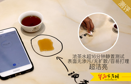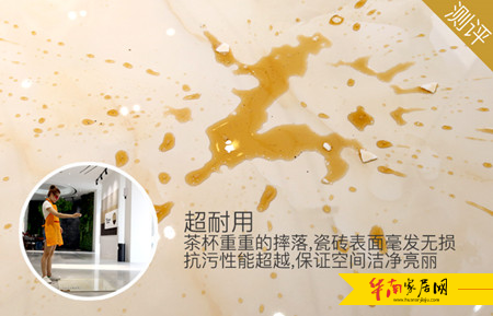 为了测试金刚微晶釉芙蓉玉脂TG8T008系列产品的抗击性及抗污性,测评人员取一只盛着茶水的茶杯,模拟生活中茶杯摔落的场景。在距离金刚微晶釉芙蓉玉脂TG8T008系列产品约1.5米处高空将茶杯摔落,茶杯摔落在金刚微晶釉瓷砖上,碎片与茶水四处飞溅,待16分钟后用试纸轻轻将茶水与茶杯碎片擦去,瓷砖釉面无损、无污渍,瓷砖依然无损,表面依旧光亮、平滑。抗击、抗污性能超强的金刚微晶釉芙蓉玉脂TG8T008系列产品,让人远离家居生活瓷砖磨损、渗污、染色等烦恼,使用更舒心。