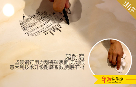 为了证明金刚微晶釉芙蓉玉脂TG8T008系列产品的耐磨性,测评人员使用坚硬的钢钉在砖面使劲刮划数十次,而砖面依旧无损,无划痕迹象。实验证实:金刚微晶釉芙蓉玉脂TG8T008系列产品硬度非常高,耐磨能力极强,适用于墙面、地面及室外环境。据了解,金刚微晶釉芙蓉玉脂TG8T008系列产品是尚豪美家创新的釉料配方结合了意大利先进的技术,全新升级了砖的耐磨系数,完胜了一般的天然石材。