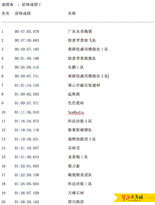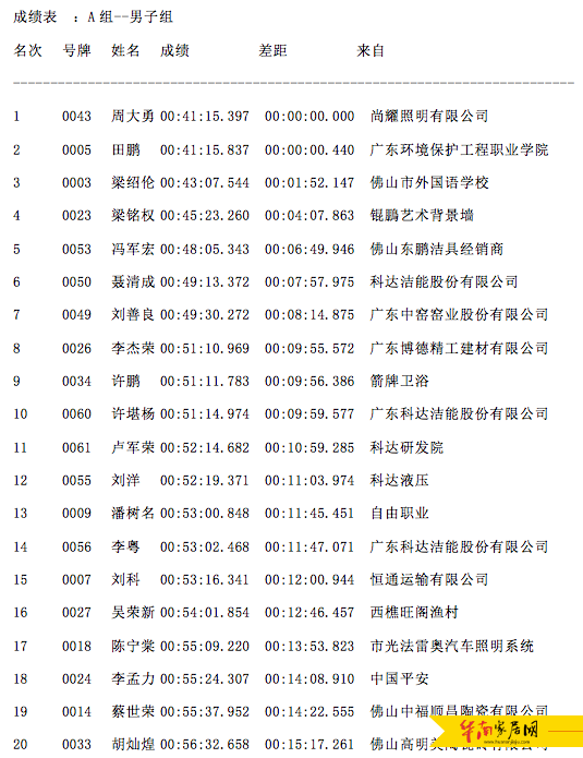 经过争分夺秒的角逐,周大勇以41:15.397成为首位冲刺的选手,一举拿下男子组冠军,紧随其后的田鹏位列男子组亚军,两人差距仅为0.44秒。女子组方面,冠军伍淑娟巾帼不让须眉,跑出了49:12.322的好成绩。广东永圣陶瓷在47:03.079全体越过终点线,成为团体第一名。现场掌声雷动,备受瞩目的是,由佛山市禅城区总工会的大力支持,特增设“职工最具魅力团体奖”,宏陶队、新中源V跑团、欧文莱素色现代砖、买砖宝在赛场上绽放的精神魅力突围而出,最终获得了千元奖金。