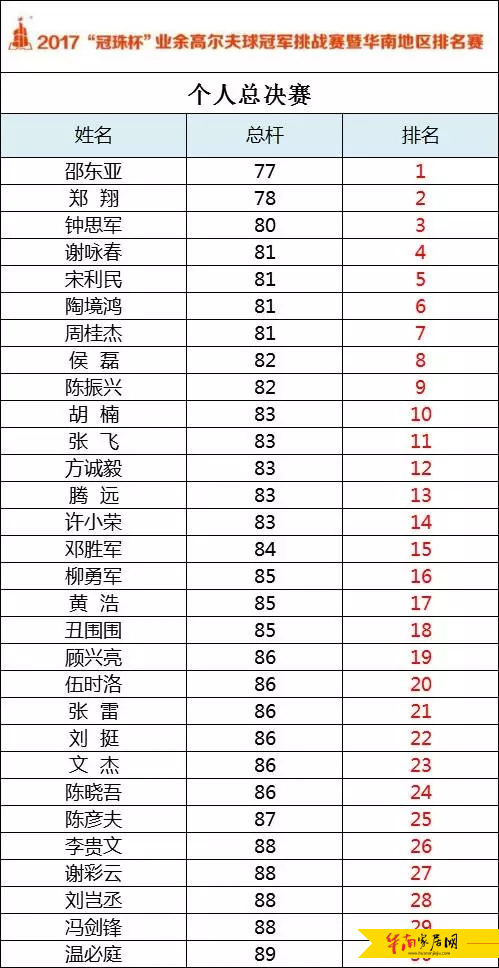 紧随其后的是郑翔和钟思军,他们分别以78杆和80杆的成绩获得亚军和季军。