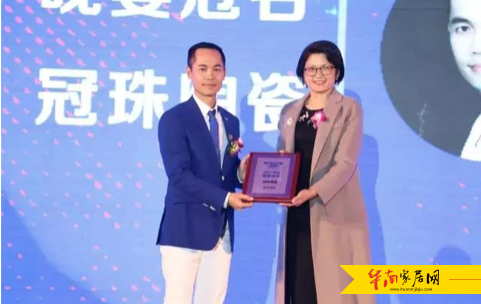 湛江设计力量总会长黄治奇为冠珠陶瓷佛山营销中心总经理何东凤年会授予紫荆奖颁奖晚宴冠名单位荣誉