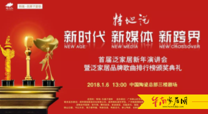 (华南家居网报道)1月6日下午,在中国陶瓷总部基地上演了一场文化盛宴。由特地负离子瓷砖冠名的“新时代,新媒体,新跨界,首届泛家居新年演讲会暨泛家居音乐排行榜颁奖典礼”在陶瓷总部基地剧场三楼隆重举行。