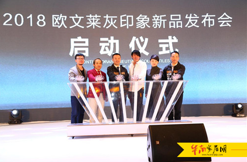 广东欧文莱陶瓷有限公司执行总裁汪加武先生、新加坡Peter Tay Studio设计机构创始人 Peter Tay先生、广州黑蚁营销管理咨询有限公司营销专家周政廷先生、国际青年设计师协会秘书长曾珍女士、广东欧文莱陶瓷有限公司市场总监梁雪青先生、广东欧文莱陶瓷有限公司国内营销总经理陈立伟先生启动“灰印象”产品发布仪式。