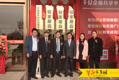 邦邦家居总裁沈耀俊、铝家居应用委员会主席杨雄权、铝家居应用商学院院长饶虎、铝家居应用设计院名誉院长彭亮、铝家居应用研究院名誉院长刘小锋、中国建筑材料流通协会副总经济师和行业研究部主任尹月晓为“三院一会”揭牌