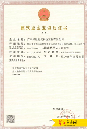 近日,蒙娜丽莎集团全资子公司广东绿屋建筑科技工程有限公司(简称绿屋建科)获得广东省住房和城乡建设厅颁发的《建筑业企业资质证书》,主要涉及建筑幕墙工程专业承包壹级资质建筑装修装饰工程专业承包壹级资质。
