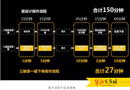 设计师正常的工作流程和三维家一键下单操作流程对比:一个订单在一个软件上从一而终,从此设计速度飞起来。