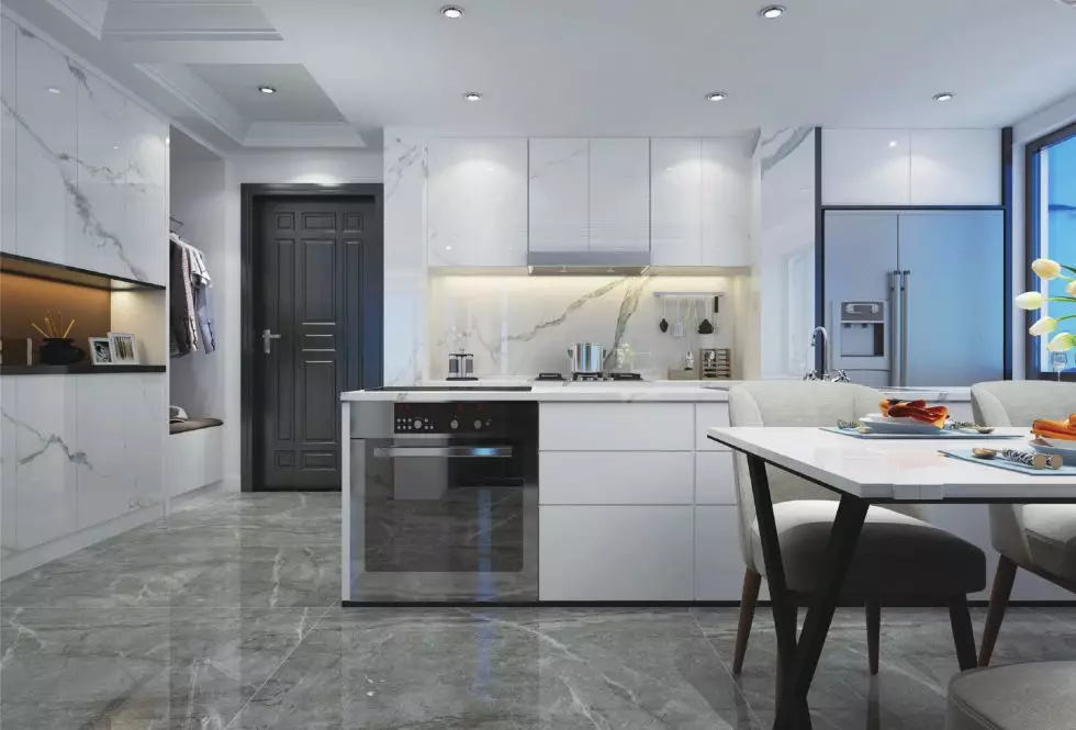 大规格瓷砖铺贴接驳缝隙少,尽显丰富的石材纹理,从视觉上给人一种空间延伸的感觉,能够有效降低长者心理上的焦虑与不安全感。