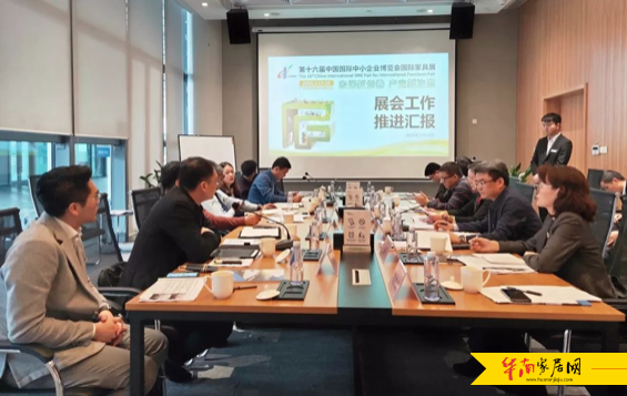 随后,一行人齐聚会议室,以月星寰博为代表的展会承办商向各政府领导汇报当前展会进展情况。