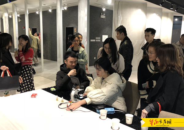 新品的魅力究竟有多大呢?本次见面会上,一众媒体在展厅依次参观了金意陶的健康砖、全瓷定制和大板。精湛的工艺和有趣的实验让现场媒体纷纷拍照发朋友圈。在健康砖的实验环节中,就激起了不少媒体朋友强烈的好奇欲,大家迫不及待地拿起面前的实验道具验证健康砖的科学性,引发一轮又一轮的互动高潮。