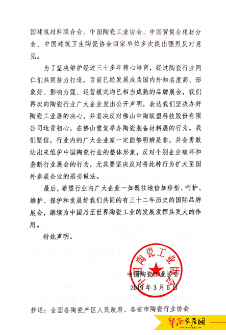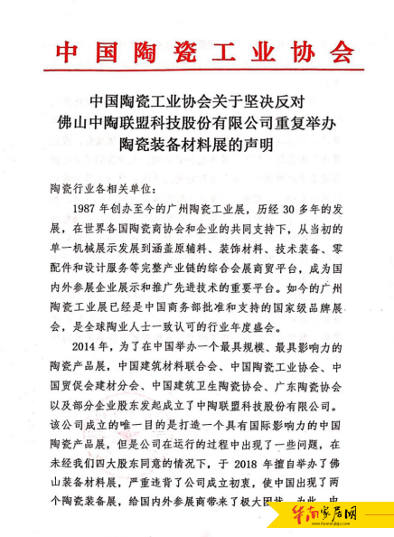 中国陶瓷工业协会关于坚决反对佛山中陶联盟科技股份有限公司重复举办陶瓷装备材料展的声明