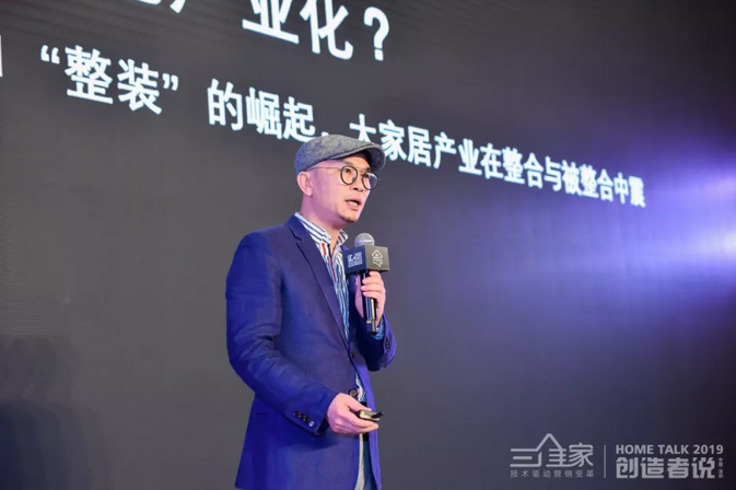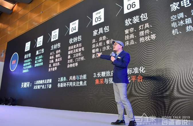 “我们都知道装修很累、很辛苦,要花很多时间,光选家具、选建材、选装饰公司就需要花几个月时间,施工周期也很长,那么整装公司带来的是什么?整装公司带来成本上最起码占30%以上,时间效率上大幅度减少,因为装修变得确定了,它已经给客户到一个很确定的认知,而且有实体样板间,消费者可以看到未来家的样子,已经不用看效果图了。过去我们帮客户选地板,铺到家里他们可能不满意,因为看样品时跟在家里的环境不一样。但今天整装的确定性大幅增加了,在展厅里看到的有光环境、空间的场景,就是他未来家的场景。所以今天的整装公司做了供给侧的改革,做了整合,他并没有创新一款新的地板,也没有创新一款新的橱柜,也没有发明什么新的技术,只是做了供给侧的改革,所以他们能够快速的成长。”
