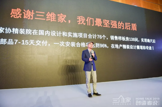 “2018年深家协精装研究院在全国主动做了76个项目,合计138个样板房,最后实现确尺完毕之后,7-15天完美交付,被万科系统评审为一次安装合格率达到96%,创造了整个中国地产圈样板房设计到交付的奇迹。感谢三维家,我们全套设备从前端的图,到后端的软件,到整个生产到交付,都是三维家这套系统做的。从服务C端转变为B端后,地产公司的样板房对我们提出了极其苛刻的要求,尤其是品质,我们做售楼样板房,时间紧迫,不容有失,所以真的要感谢三维家。”