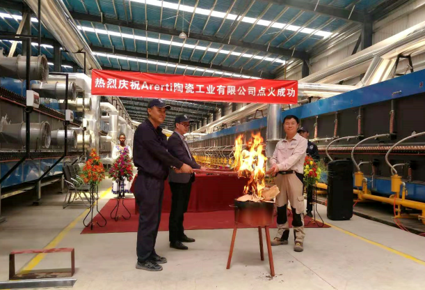 (华南家居网讯)非洲当地时间3月15日11时18分,由广东中窑窑业股份有限公司为中交埃塞俄比亚ARERTI陶瓷工业有限公司建造的一组中窑神舟ZY777,2484mm/L310m型窑炉,日产20000平方米的地砖窑炉顺利投产!中交埃塞俄比亚ARERTI陶瓷工业有限公司总经理陈玉山、财务总监胡元征、生产副总经理张友利一起为厂里第一条窑炉点上第一把火,在场的相关职能部门领导和员工致以热烈的掌声表示美好祝愿。炉内火焰熊熊升腾,标志着中交产业投资控股公司再次实现新突破、新跨越。