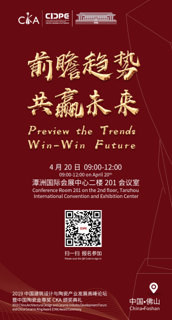 (华南家居网讯)2019中国建筑设计与陶瓷产业发展高峰论坛暨中国陶瓷金尊奖CKA颁奖典礼将于4月20日在潭洲国际会展中心隆重举行。