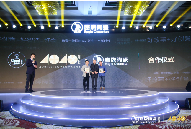 随后,鹰牌集团副总裁陈贤伟先生、广州设计周执行总监贺文广先生、goodone旧物仓创始人杨函憬先生,在数千人的见证下交换双方信物,开启鹰牌陶瓷 X 40 UNDER 40 X 旧物仓合作仪式。当鹰牌陶瓷遇见40 UNDER 40和旧物仓,智造业×设计师×生活美学跨界融合,会碰撞出怎样的火花?“给我一段旧时光,还你一个新时代”,好故事+好创意+好智造=好物的公式是否可以实现?让我们拭目以待……