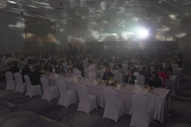 如果说白天的峰会是一场思维碰撞,那么晚上的宴会则是一场格调不凡的奢雅盛宴。黑色的稳重,灰色的高端,金色的奢华,三者配合花艺布置,会场摇身一变成为奥斯卡的颁奖典礼现场。