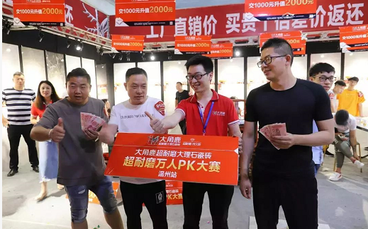 而在乐清家博会,一位现场观看了“大角鹿超耐磨万人PK大赛”的消费者,果断购买大角鹿。“我的第一套房子装修用的不是品牌瓷砖,质量特别差,这次我一定要选择品质过硬的大品牌。”在温州市场,大角鹿“品牌响、超耐磨”的大品牌形象口口相传,得到消费者的广泛认可。