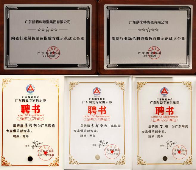 广东新明珠陶瓷集团有限公司和广东萨米特陶瓷有限公司入选陶瓷行业绿色制造指数首批示范试点企业;广东陶瓷协会聘请新明珠陶瓷集团副总裁简润桐,集团营销管理中心副总经理、集团设计院院长李宥莹,集团康烯明珠市场部总监丁刚为广东陶瓷专家俱乐部专家,聘期两年。