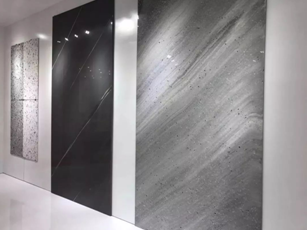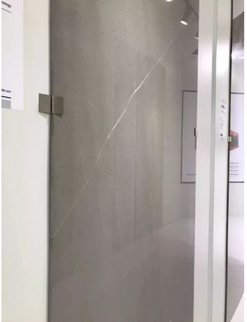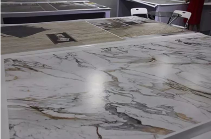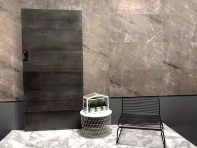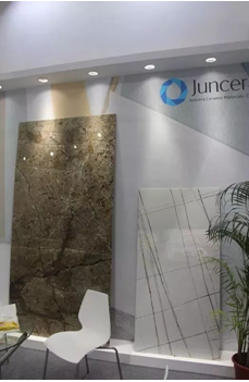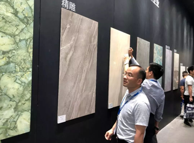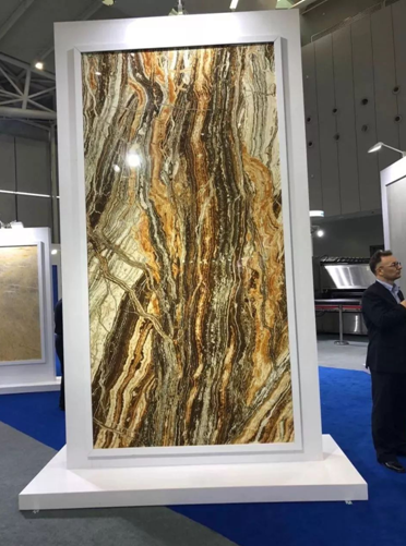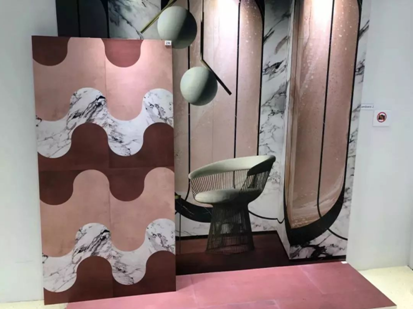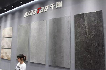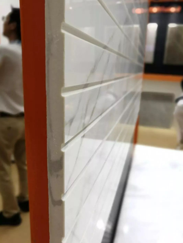展位还展示了系列1000×3000(mm)规格的陶瓷大板,工艺上包括:激光雕刻、通体布料等。其中,使用通体布料工艺生产而成的陶瓷大板能实现全通体效果,邱子良表示:“可以真正取代天然石材”。