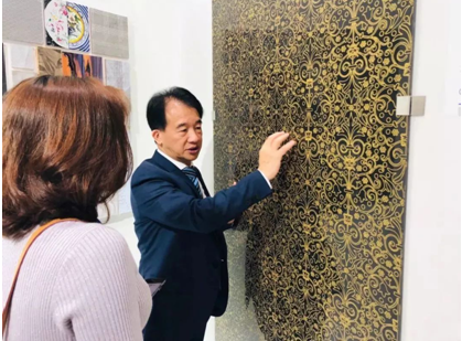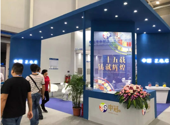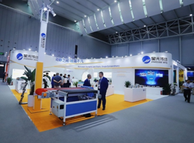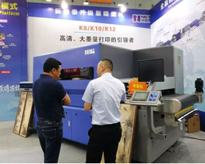 主要展示了数码墨水产品,推出了新的工艺:深刻墨水加胶水干粒。据介绍,该工艺主要利用深刻墨水、胶水干粒两道工序的时间差,在深刻墨水干透,胶水还未干时将干粒布上,从而形成特殊的表面效果。