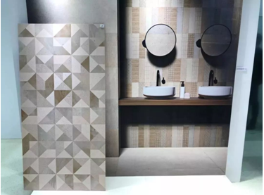 此外,意达加还研发了系列无釉或少釉的墙地砖产品。这样做的好处在于,可以使产品更接近天然石头。展位展示的地砖基本上都为无釉产品,直接在坯体里面进行装饰,80%的装饰效果在坯体,20%的装饰效果在表面,最后再撒上干粒进行保护。