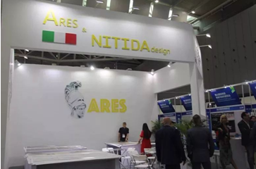 主要展示了大板的应用,展厅概念以地中海别墅风格为主,用多个台阶使展位呈现出依山而建的别墅感。与去年里米尼展上主推的水性墨水、数码喷釉产品相比,今年陶丽西主要以干粒抛、数码釉为主,在产品细节上寻求突破。