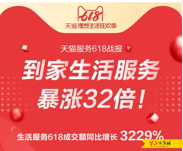 而在家居生活服务领域,根据天猫无忧购最新发布的《天猫服务618战报》中的数据显示,到家生活服务爆涨32倍,生活服务618成交额同比增长3229%。生活服务爆品TOP3,分别被苹果手机换屏、家政保洁、灯具风扇类安装服务所占据。