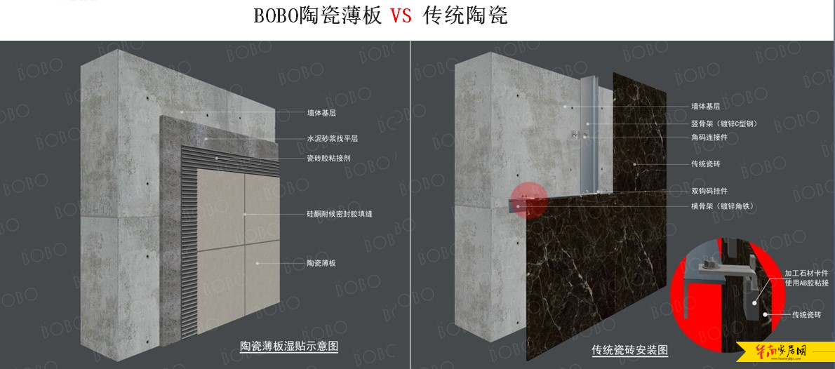 目前,传统外墙装饰材料如天然石材、传统瓷砖等比较厚重,物流成本高,施工工艺复杂;涂料和金属单板效果单一、档次不高,后期保养频繁。而LA'BOBO陶瓷薄板既轻且薄,不仅可以降低物流仓储成本,而且建筑立面24m以下直接湿贴,大大减少施工难度,并省去干挂龙骨结构高昂的辅料、施工和维护费用。