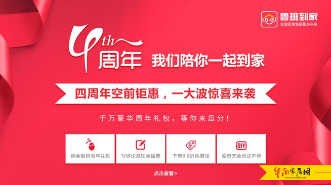 值此四周年之际,鲁班到家正在开展一系列优惠和福利活动,砸金蛋抢周年礼包、写评论赢现金话费、免费领超值9.6折优惠、充值送爱奇艺会员等主题活动今天正式上线,价值千万的巨额福利,力度之大,前所未有。