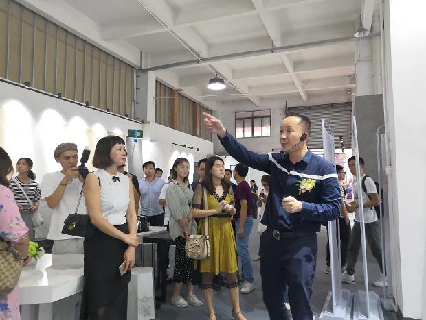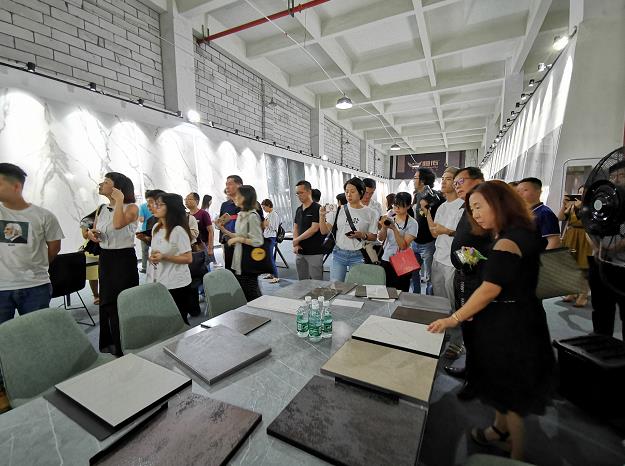 媒体嘉宾一行人参观LAMIS® STONE(拉米斯岩板)展厅,在近距离观摩和亲身体验中感受LAMIS® STONE的匠心。