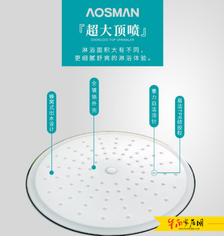 超大顶喷,蜂窝式出水设计,淋浴面积大有不同,更细腻舒爽的淋浴体验。全镀铬外壳时尚美观,重力自洁顶针与易洁TPR硅胶粒防堵性强,轻轻一拔即可除垢,洁净无菌。