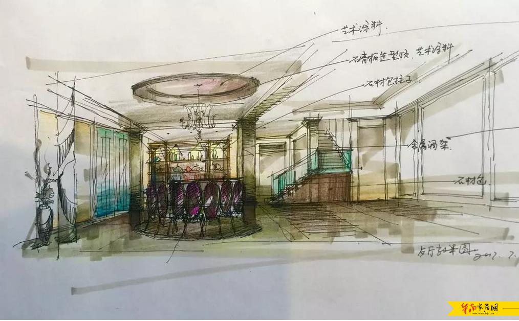 设计师将业主脑海里的家通过讲究色彩与结构的手绘图还原在纸上。相对于较完美的电脑制作的效果图,手绘图是更具生活气息与生命力的。设计师胡均表示,“家的设计最动情之处永远在于丰盛的生活。”