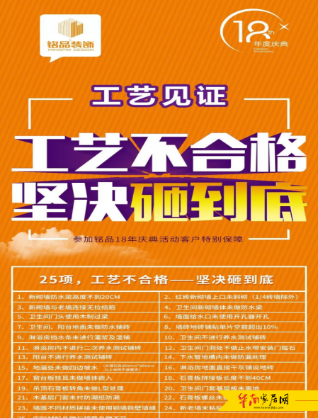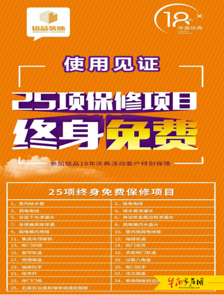 25项保修项目,涵盖多项水电相关的隐蔽工程,终身免费!铭品用感恩的心回馈社会和一路同行的老友们,让装修真正无后顾之忧!