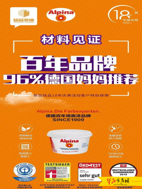 18年庆典之际,墙面漆免费升级为德国百年企业阿尔贝娜,这家遵循护墙如护肤理念的墙面漆品牌,在调研中获得了百分之96德国妈妈的推荐。