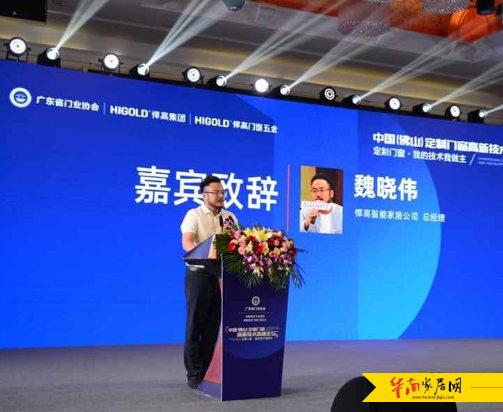 悍高智能家居公司总经理魏晓伟在会上发言。他提到了悍高针对门窗五金市场进行了三年的调研,就门窗行业的发展前景以及未来的方向发表了一些看法与见解。