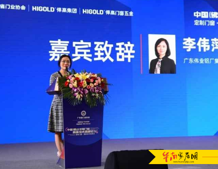 广东伟业铝厂集团有限公司董事总经理李伟萍上台发言。她回顾了伟业的整体发展历程以及目前正在进行的发展方向,在未来将会积极推动中国系统门窗在技术方面的升级,助力中国智造。