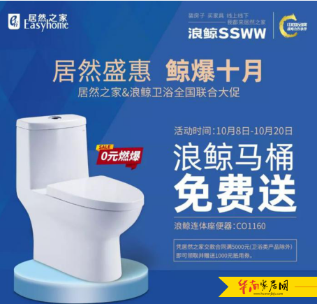 (华南家居网讯)10月8日至20日,“居然盛惠 鲸爆十月”浪鲸卫浴&居然之家全国联合大促活动盛大启动,企业与卖场强强携手,推出重磅优惠——浪鲸马桶免费送,燃爆金九银十家装旺季,为消费者打造钜惠盛宴。