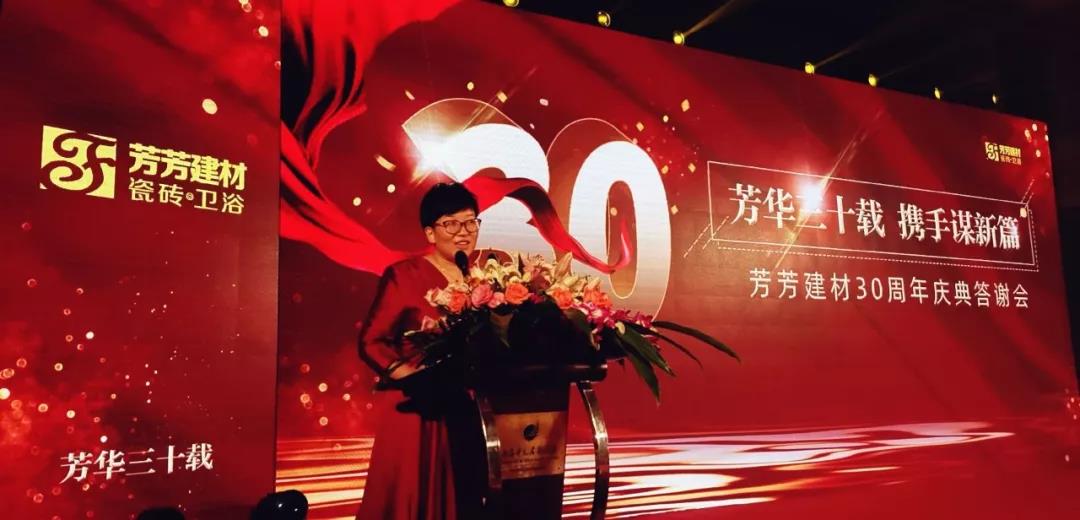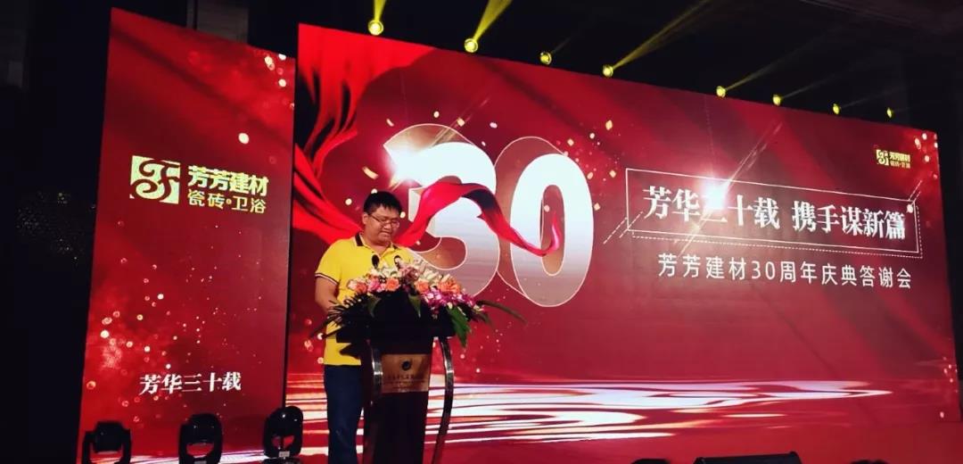 (华南家居网讯)2019年10月9日,芳芳建材30周年庆典活动在余杭圆满举行。芳芳建材创始于1989年,于1996年正式成立,杭州余杭最大的建材市场之一。此次30周年庆典活动不仅是芳芳建材对30年来发展历程的回顾、对未来战略的思考与展望、更是对每位选择芳芳建材的新老业主的感恩典礼。