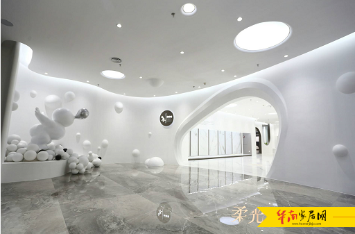 整个展厅以四季为主题,贯穿一楼选材区和二楼四大专项展馆。一楼玻璃装置造景——春域,郁郁葱葱,绿意盎然,寓意华鹏新生,成群结队的白色装置小鸟,寓意华鹏之鹏,鹏舞天下,扶摇直上,带着春的信号,飞入二楼展馆。二楼石材馆+工程馆+木纹馆+白砖馆四大展馆,依据不同品类瓷砖特性分别阐述春夏秋冬四季主题。白砖馆入口处的冰雪精灵,轻吐白色泡泡,营造出一片冰雪世界,更是预定了下一个网红打卡点。