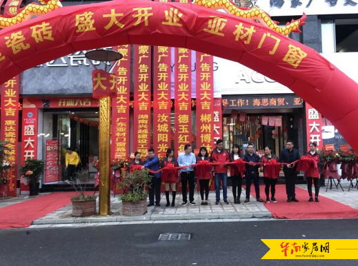 开业活动在主持人热情洋溢的开场白下拉开序幕,盛邀惠达瓷砖国内营销中心总经理孔智勇先生、广州亚材门窗幕墙有限公司营销总监颜军先生、惠达瓷砖区域经理何国彬先生、广州亚材门窗幕墙有限公司华中湘区域经理王俊龙先生、海思商贸有限公司总经理何勤先生进行剪彩仪式。