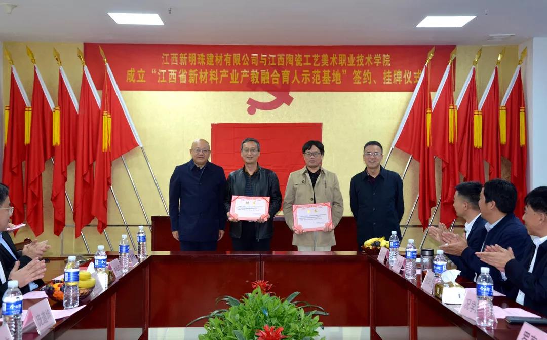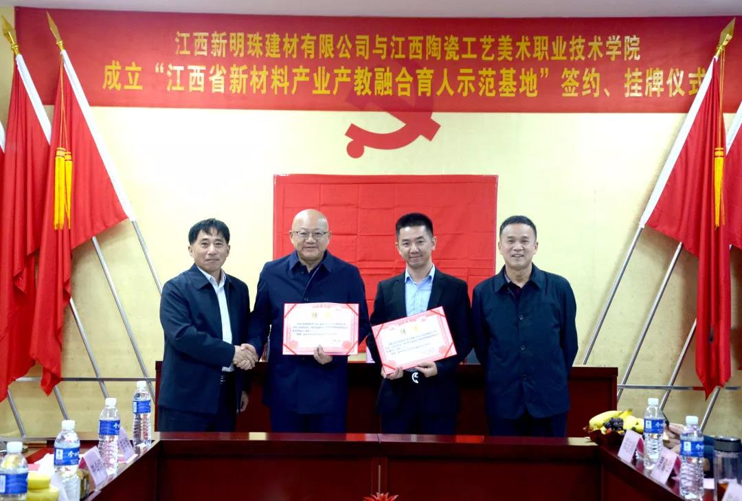 11月6日,在高安市副市长况学成,江西陶瓷工艺美术职业技术学院院长陈华龙、副院长罗亨江,江西新明珠建材有限公司总经理庞道坤等领导嘉宾的见证下,江西新明珠建材有限公司与江西陶瓷工艺美术职业技术学院签订合作协议,正式成立了“江西省新材料产业产教融合育人示范基地”。