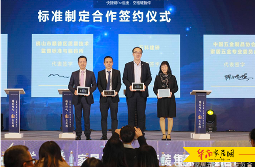 标准制定合作签约仪式:珠海采筑电子商务有限公司、佛山市顺德区质量技术监督标准与编码所、东莞市万科建筑技术研究有限公司、家居五金专委会