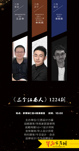 由江西设计力量指导,华南家居装修网、华人设计师网联合承办的系列访谈录《三个江西人》栏目1224期,在江西设计力量运营中心顺利举行。特别感谢麦典家居商学院、ID+1设计师网、《今日设计》杂志对本栏目的大力支持。