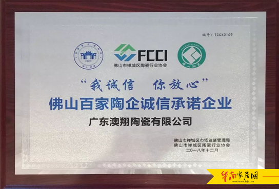 1月5日,在第七届中国(佛山)陶瓷发展年会上,澳翔瓷砖荣获“我诚信,你放心”佛山百家陶企诚信承诺企业称号。