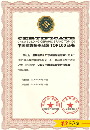 10月19日,在首届建筑陶瓷『国潮精品』论坛,暨2019建筑陶瓷品牌TOP100榜单发布会上,澳翔瓷砖一举夺得“2019中国建筑陶瓷百强品牌”大奖!