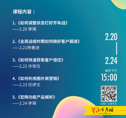 宏陶陶瓷为了全方位推动学习进程,宏陶总部一直谋划形式灵活、内容丰富、导师强大、极具实战的网络培训直播平台。自2月20日起在万众期待下,直播平台首课《如何调整状态打好开年战》正式上线,引起听课的500多位学员强烈反应、好评如潮。